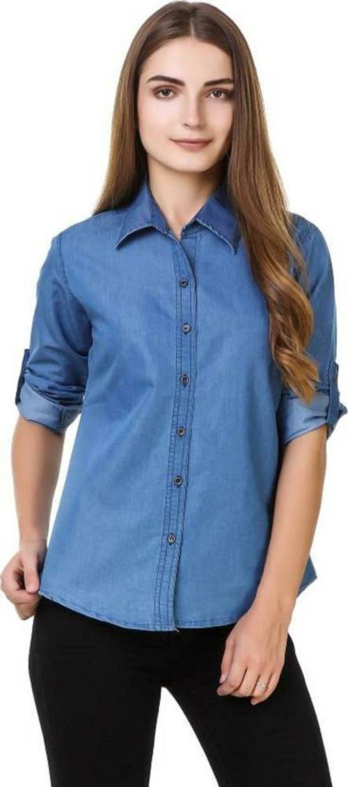 OOTPTAANG Women Blue Solid Denim Casual Shirt - L