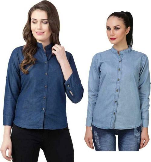 OOTPTAANG Women Blue Solid Denim Casual Shirt - S (Pack of 2)