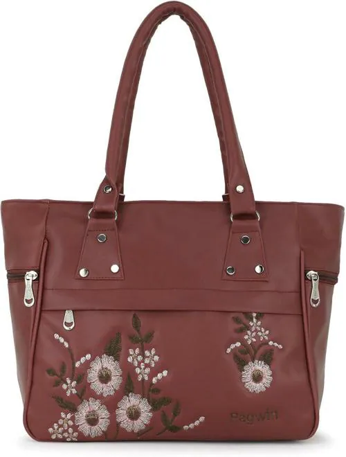 Pagwin Brown Polyuthrane Women Handbags Flower Embroidered Fashion Satchel Bag (PG-0051-BROWN)