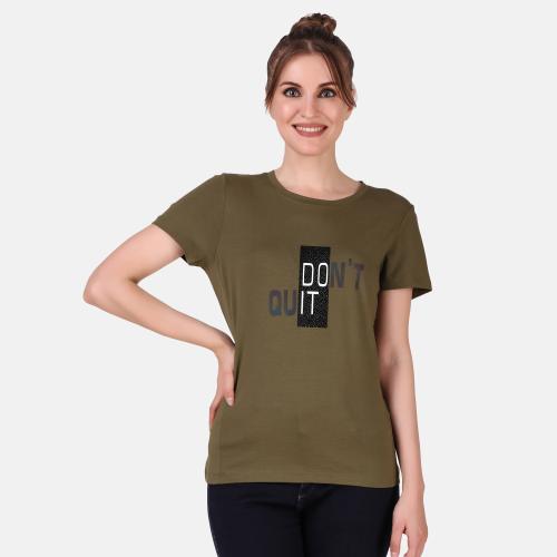 PERFKT-U Olive Women Typography Printed Cotton T shirt(L)