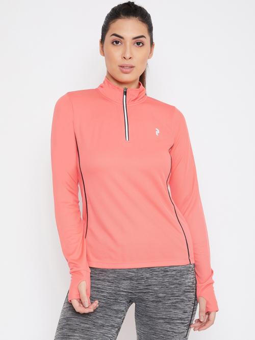PERFKT-U Women Peach-Coloured Solid High Neck Dry Fit Workout T-shirt(L)