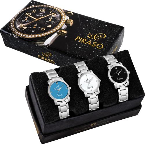 Piraso Analog Black, Blue, White Dial Silver Strap Watch For Women And Girls (Pack Of 3)