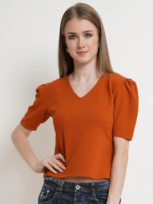 Popwings Women Casual Puff half Sleeves V Neck Rust Top