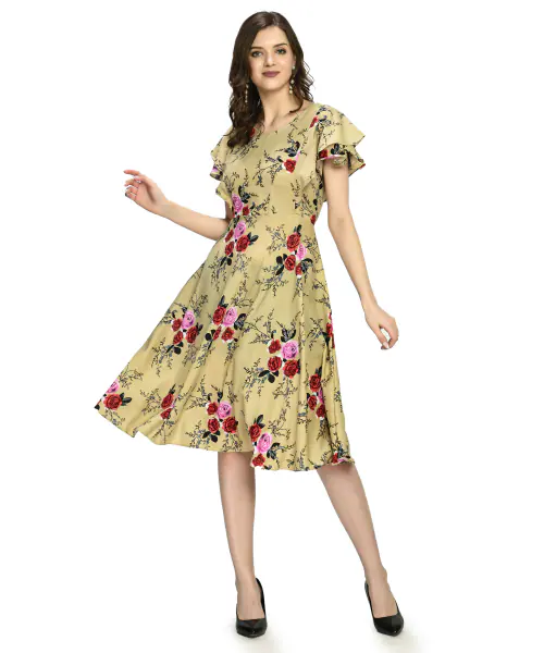 Preego Women Cream Floral Printed Mini Girl Dress And Women Dress