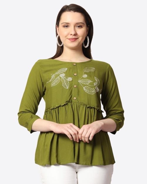 Prettify Casual Embroidered Women Green Top