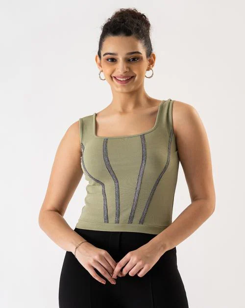 Prettify Women Green Solid Cotton Blend Single Tops
