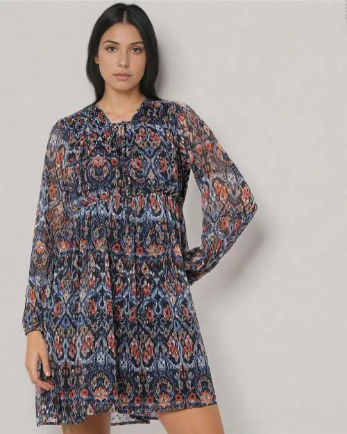Printed A-Line Dress with Neck Tie-Up