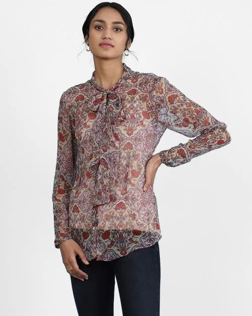 Fitted Printed Shirt with Band-Collar & Tie-Up