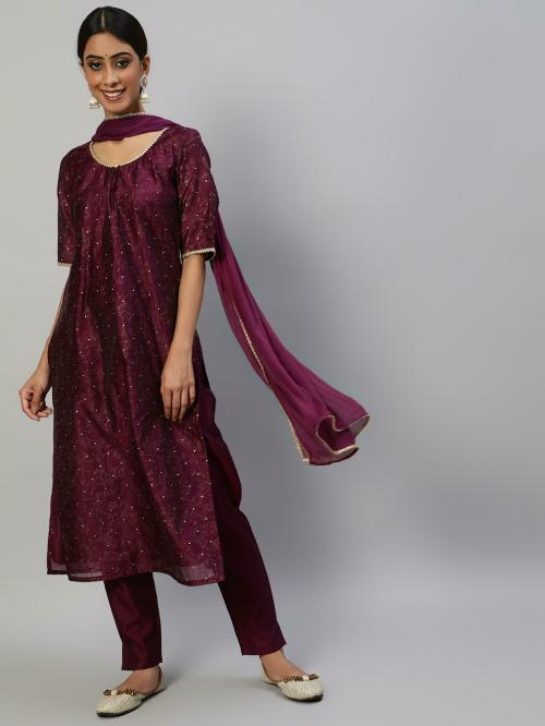 Purple Gold Printed Kurta Pant With Dupatta Set