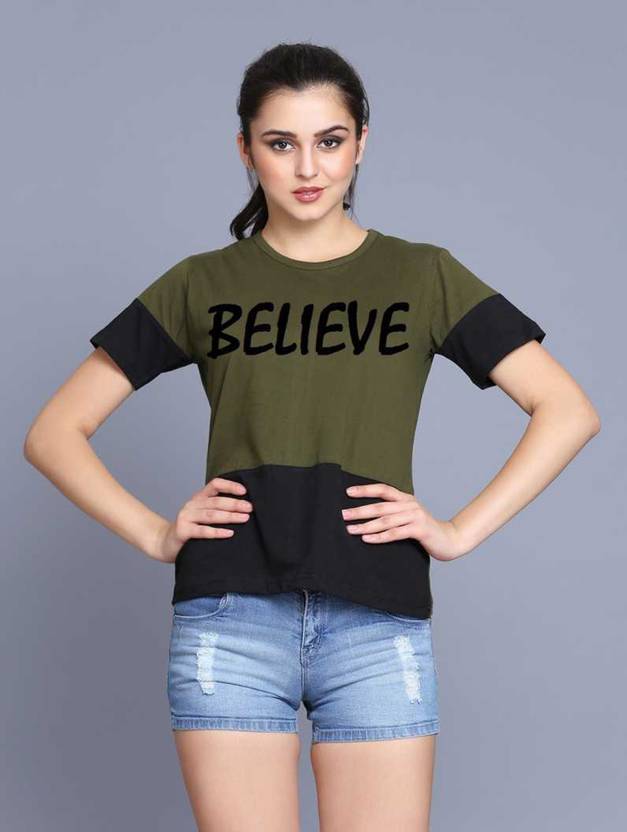 Quity Fashion T-SHIRT Women Color Block Round Neck BELIEVE T SHIRT|GREEN| M
