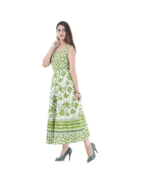 Rangun Women Maxi Cotton Green Color Printed Dress