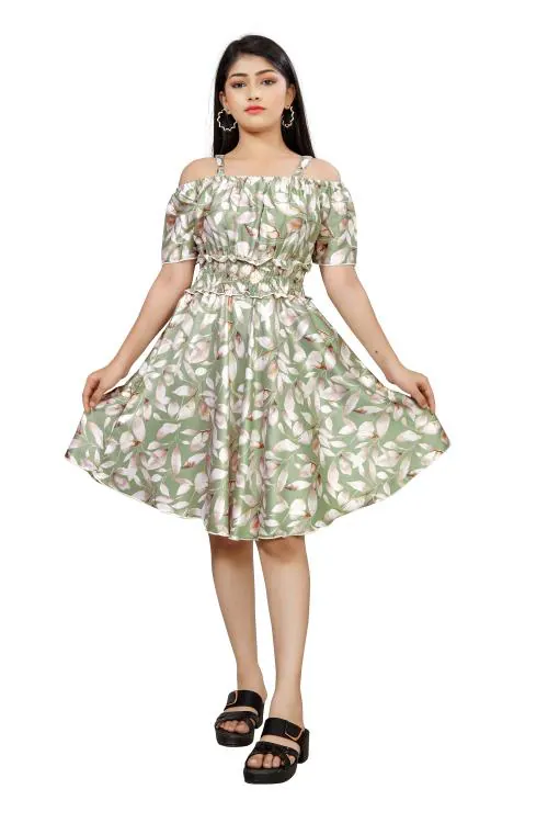 RK MANIYAR Keeping i6 fresh : A Fi6 & Flare Leaf Printed dress for girls ( Green )