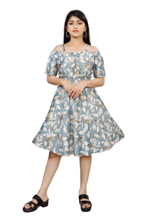 RK MANIYAR Keeping it fresh : A Fit & Flare Leaf Printed dress for girls ( Blue )