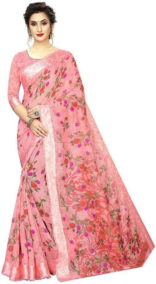 Rooptara Women Pink Cotton Jute Blend Floral Saree With Blouse Piece
