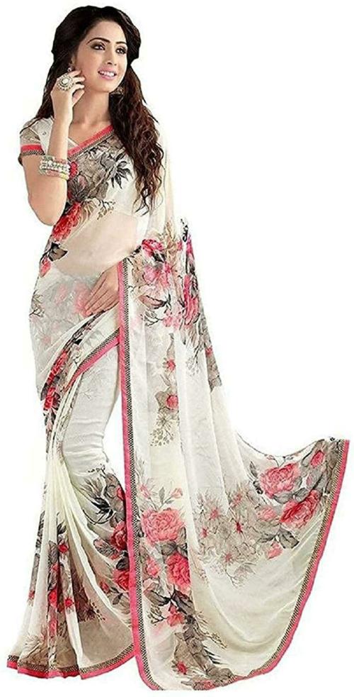 Rooptara Women White Georgette Floral Saree With Blouse Piece