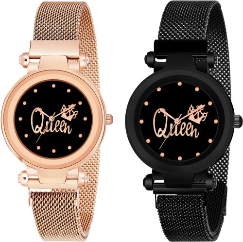 Rozti Analog Black Dial Black Strap Watch for Women (Pack of 2)
