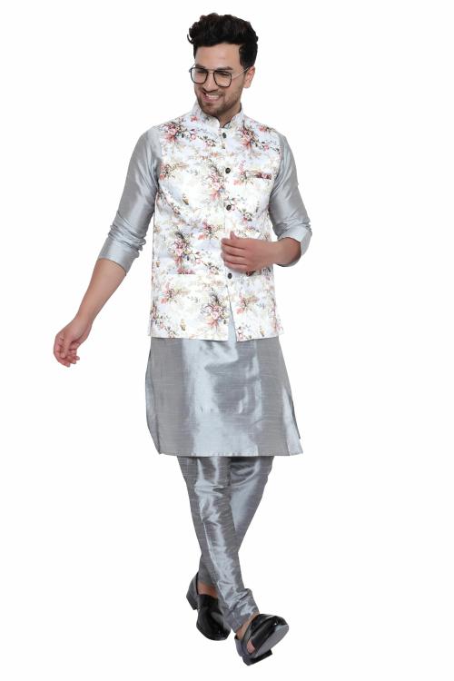 RYLEN Men Kurta, Waistcoat and Pyjama Set Silk Blend