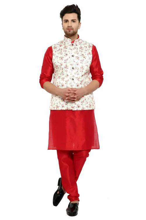 RYLEN Men Kurta, Waistcoat and Pyjama Set Silk Blend