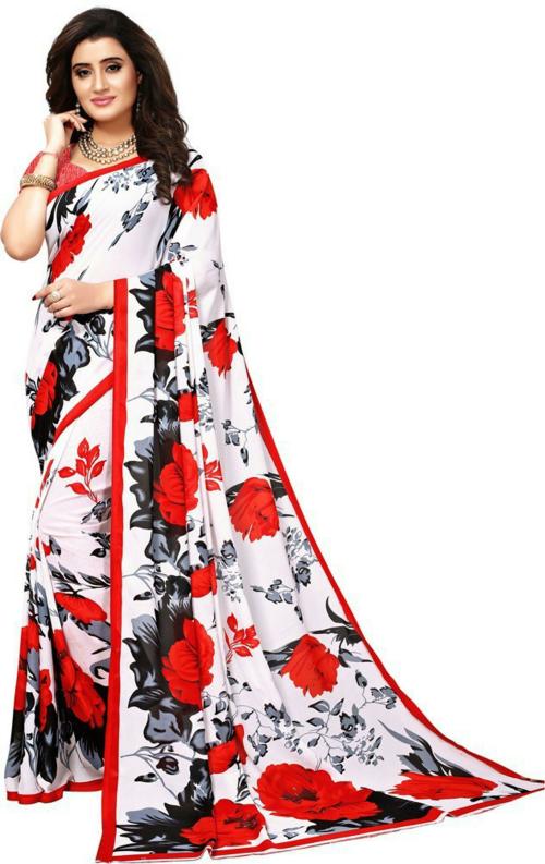 Rooptara Women Red, White, Grey Georgette Floral Printed Saree With Blouse Piece