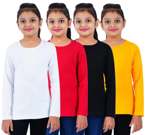 San Tee Girl's Solid Cotton Full Sleeve Round Neck T-Shirt 2-3 Years (Multicolor, Pack of 4)