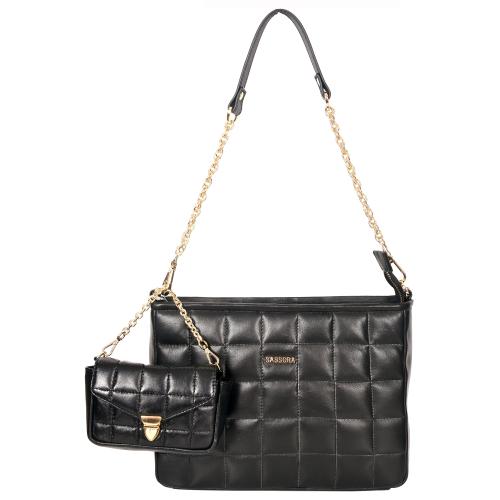 Sassora Genuine Leather Black Quilted Designed Shoulder Bag