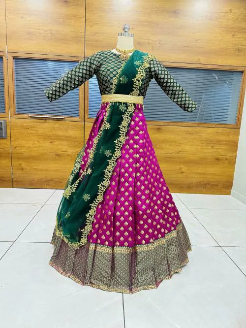 Fabcartz Self Design Unstitched Litchi Silk with Zari work Lehenga Choli (Rani)