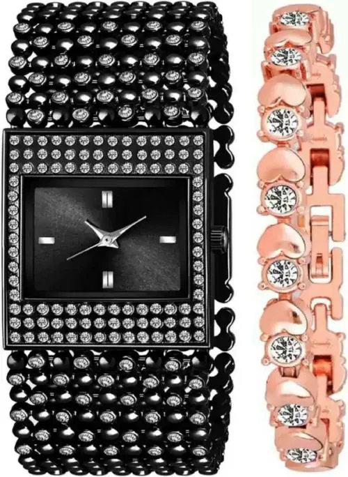 Selloria Analog Black Dial Studded Metal Strap Watch, Rose Gold Diamond Bracelet for Women and Girls