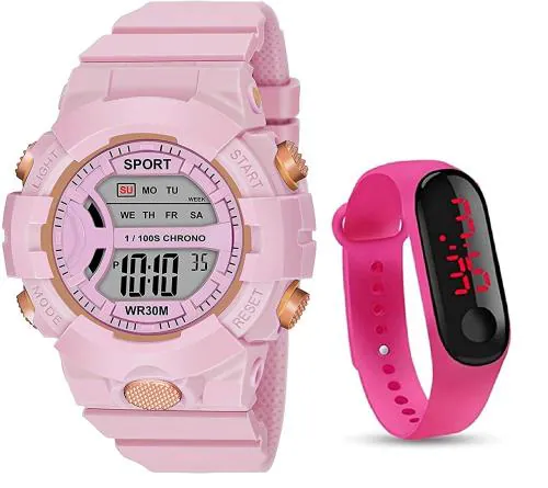 Selloria Digital Multicolor Dial Pink Strap Watch For Girls (Pack Of 2)