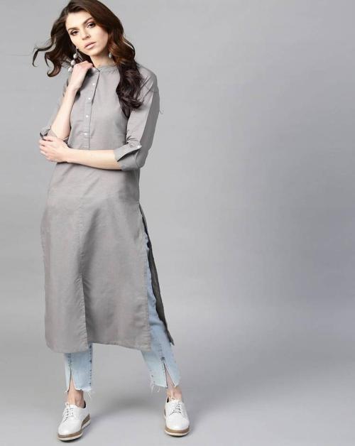 serving princess Women Grey Solid Cotton Linen Blend Straight Kurta - S