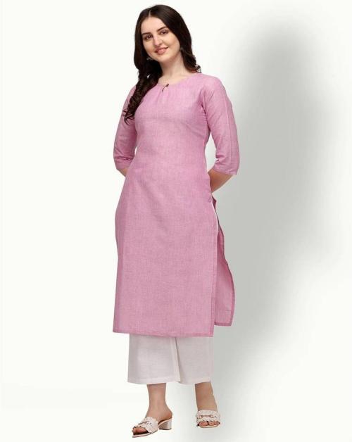 serving princess Women Pink Solid Cotton Blend Straight Kurta - XL