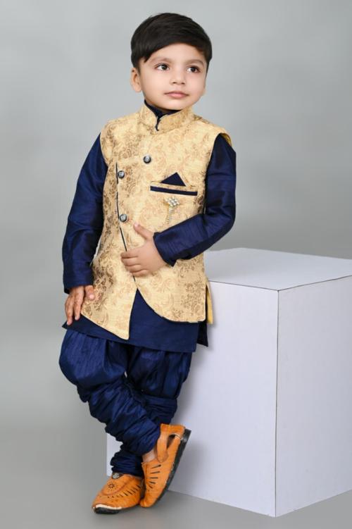 SFC FASHIONS Boys Blue Printed Art Silk Kurta, Waistcoat and Pyjama Set - 5 to 6 Y