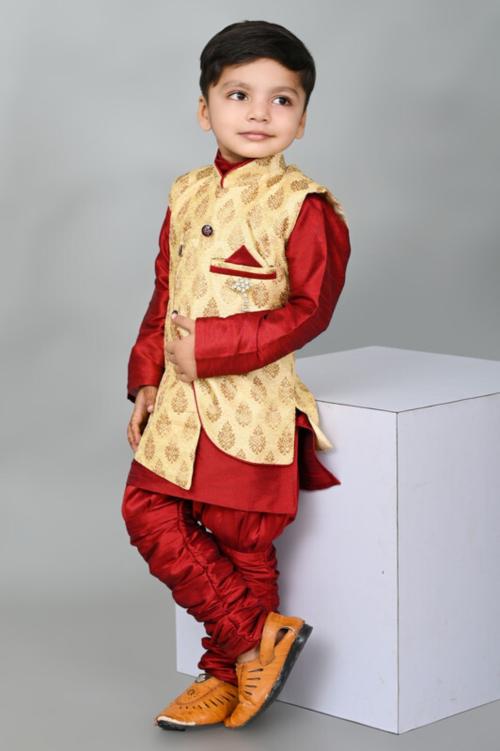 SFC FASHIONS Boys Maroon Printed Art Silk Kurta, Waistcoat and Pyjama Set - 1 to 2 Y