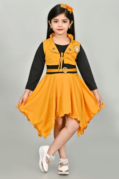 SFC FASHIONS Girls Yellow and Black Cotton Blend Gathered Dress - 10 to 11 Y (A-460 Yellow)