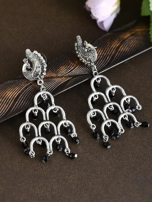 Shoshaa Silver-Plated oxidised black beads peacock shaped drop earrings