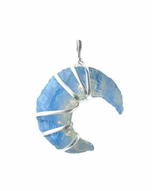 - This opalite moon pendant, carefully hand wrapped with stainless steel wire.This necklace is perfect for a moon goddess like you.A timeless accessory that promotes inner beauty healing.Make a statement with this unique pendant featuring moon shaped natural healing stone. Known to enhance overall wellbeing, these pendants have the given benefits