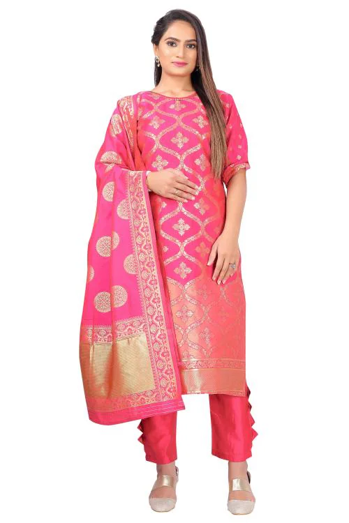 Silk Blend Women Banarasi Jacquard Pink Color Dress Material