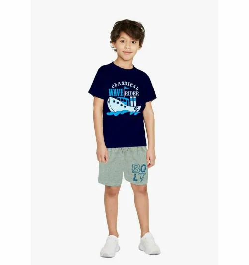 Silverfang Boys Navy Blue Printed Pure Cotton T-shirt with Shorts