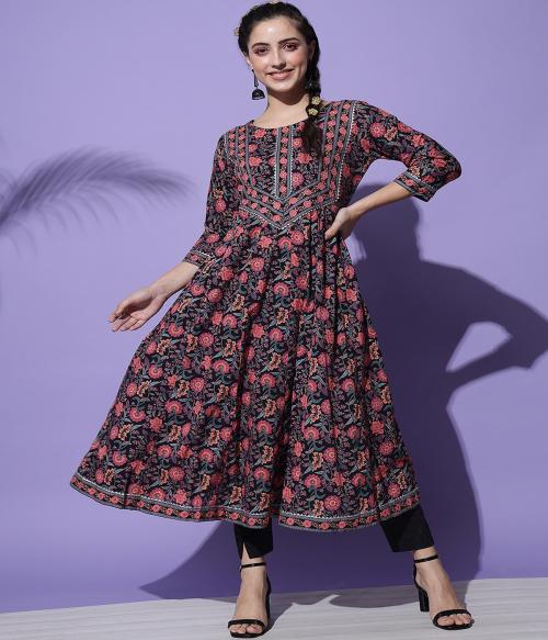 Sitaram Designer Women Black Ethnic Motifs Printed Cotton Kurta