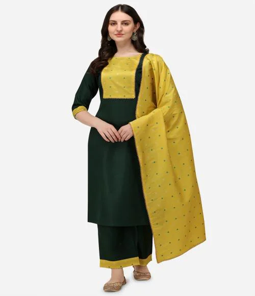 Sitaram Designer Women Dark Green Jacquard Patch work Cotton Blend Straight Kurti, Palazzo with Dupatta