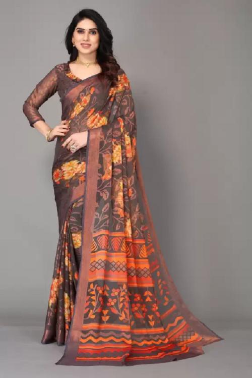 SkyTara Floral Print Bollywood Chiffon, Brasso Saree (Grey)