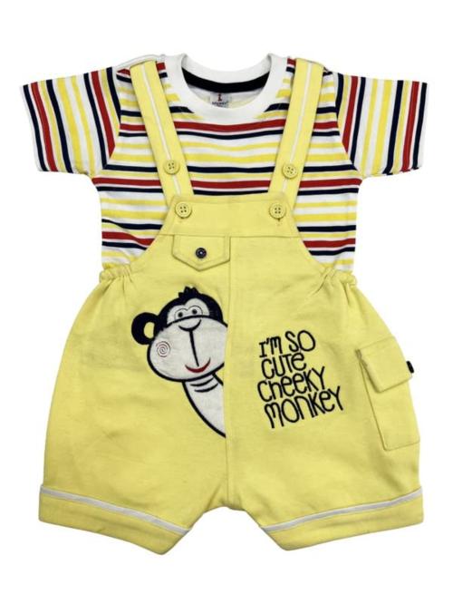 SPONGY Baby Boy and Girl Striped and Printed Cotton Blend T-Shirt with Dungaree Shorts
