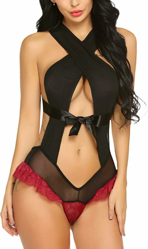 SSoShHub Women Black Self Design Lace Baby Doll Lingerie Set