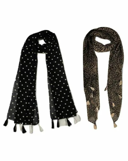 StoleVilla Women's Printed Chiffon Multicolored Scarf and Stoles with Tassels - Set of 2