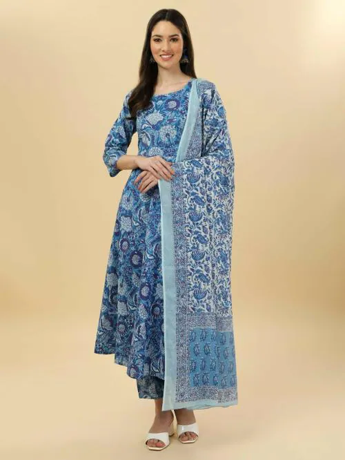 Sun Fashion And Lifestyle Women Blue Floral Print Pure Cotton Kurta, Pant And Dupatta Set (M)