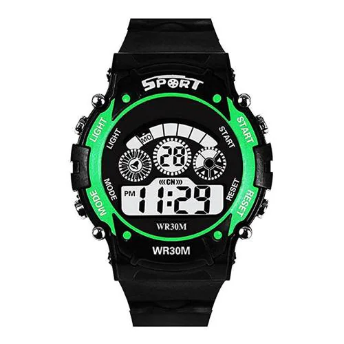 Brand name - Swadesi Stuff Swadesi Stuff multi function sports digital kids watch for boys and girls kids digital collection watch the funky design on this Swadesi Stuff watch is unique and attracts instant attention. This digital watch for kids has multi function mode in the watch and 7 different back light in watch, round-shaped dial digital movement, a back casing that is made of stainless steel and a crown to adjust the time and date. The strap is black coloured and has a comfortable buckle clasp closure.