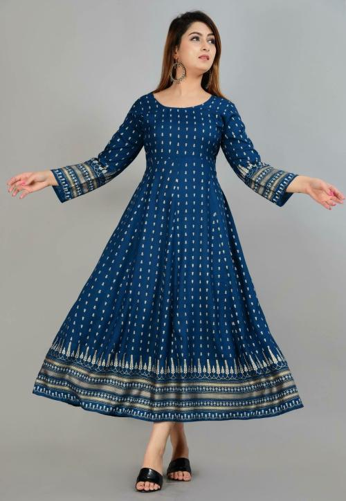 The Fab Factory Women Dark Blue Printed Viscose Single Anarkali Kurta