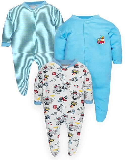 Tiniberry Baby Boys and Girls Light Blue Striped, Printed Cotton Blend Pack of 3 Romper 12-18 MONTHS| Rompers |Sleepsuits | Jumpsuit |Body suits
