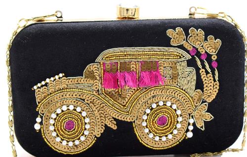 Tooba Handicraft Black Velvet Women Designer Clutch Bag With Chain Strap