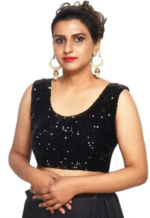 Trendzmy Women Black Embellished Silk Blend Round Neck Blouse, Free Size