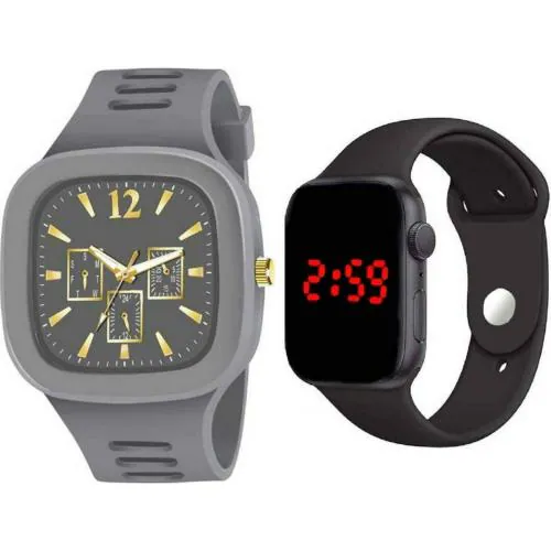 Trex Stylish Casual Sport Square LED Analog to Digital Watch Grey Dial Grey Strap for Boys and Girls (Pack of 2)